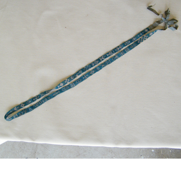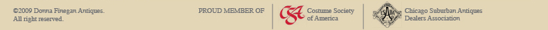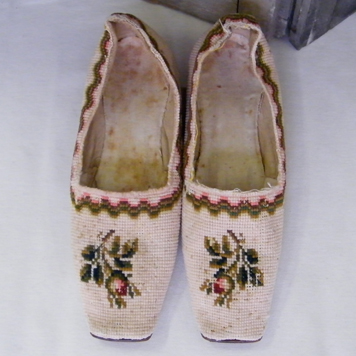 | Pettipoint SlippersPettipoint women's slippers in ivory with roses and pink and green border. Linen and leather lining with leather soles, square toes with the sole being only slightly narrower at the toe than at the ball of the foot. Waist is far back so that the small narrow heel constrats with the long board tread. C1835 - 1847. $350 | Bead ChainBlue and pearl colored glass bead chain from the mid 1830's. Mary A. Wilson, a key, urns, cross, arrows, anchor and entwined hearts are woven into the chain. Has original blue silk ribbon ties Approx. 13 beads per inch. Minor bead loss. $325 | ||