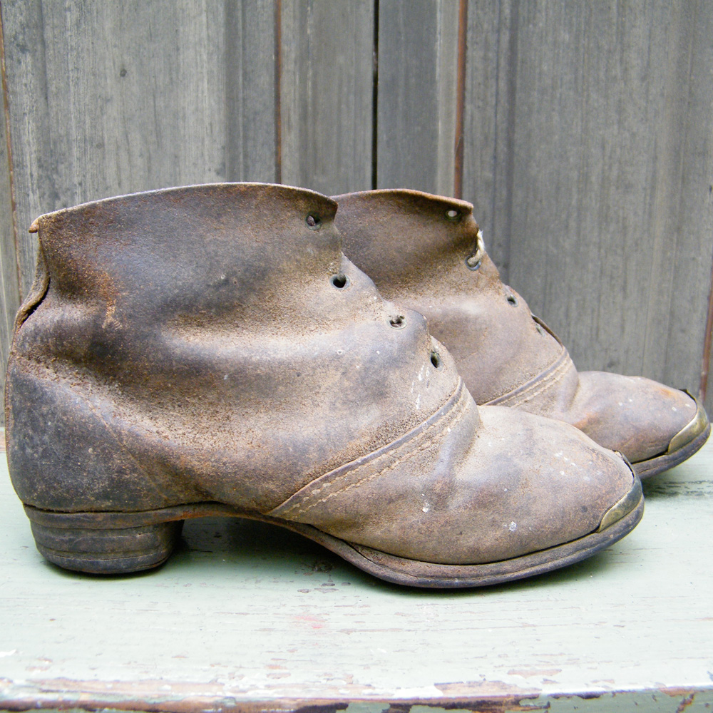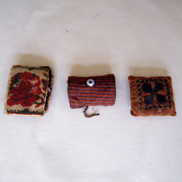 | Boy's BrogansBoys leather work shoes or brograns, with pegged souls, spring heel, rounded toe and open tab. Mass produced in New England. Many were exported South and to the West Indies for use by Slaves Example pictured on page 115 in "Women's Shoes in America 1795 - 1930 by Nancy Rexford. C1840 to 1860. Very rare. $250 | Assorted Purses (From Left)- Make-do pettipoint neele case. 19th century. $85 - Unusual orange and purple homespun rollup with china button. C1850. $95 - Tan and cream checked pin cushion with embroidered star. $95 |