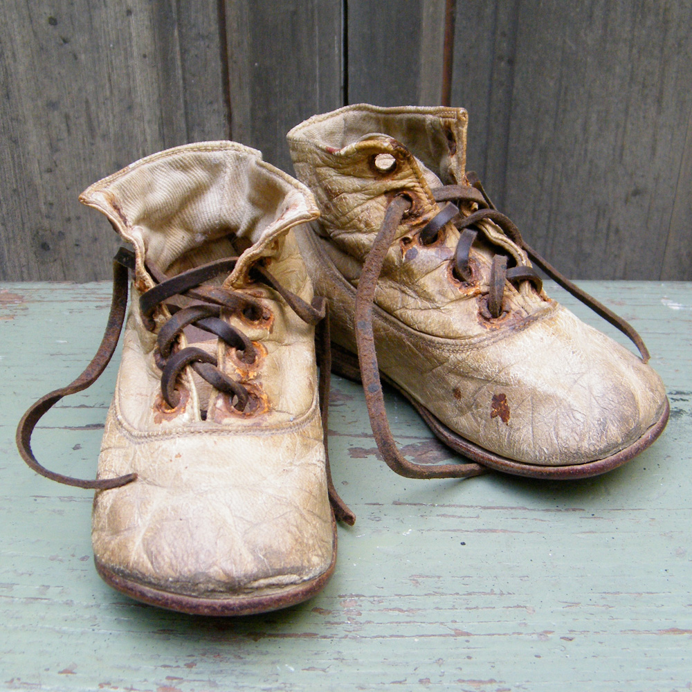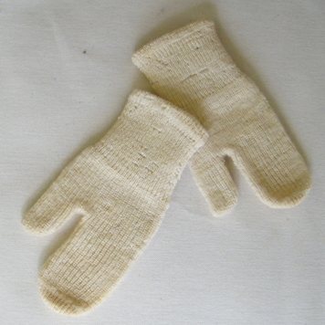 | Oxford Style Shoe Pair of Oxford style children's shoes with rounded toe, stacked nailed heels, with a tongue, and five lacing holes with original leather ties. C1870 - 1880. $85 | White Knitted Mittens19th century. $95 | ||