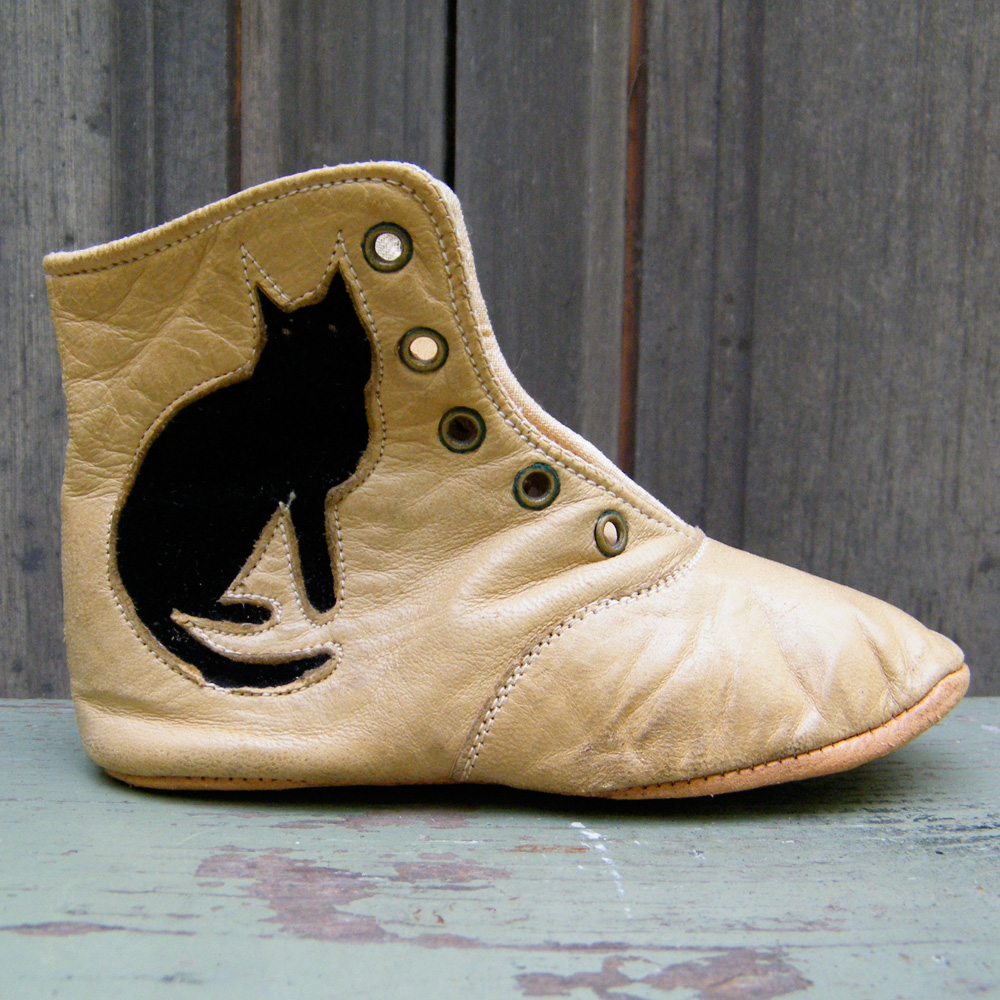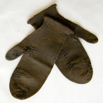 | Leather Cat Shoe One child's shoe or half boot. Soft light tan leather with an appliqued black leather cat on both sides. Five, front lacing holes with a tongue, rounded toe, circular vamp, no heel and back seam. C1850 - 1860. One of a kind. Very cute. $95 | Brown Knitted Mittens19th century. $95 | ||