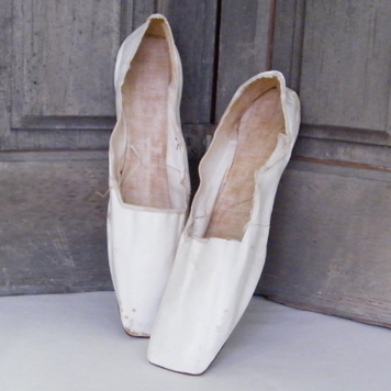 | Kid Leather SlippersWhite kid leather women's slippers with board, square toe and square throat. Waist is far back and has a circular vamp and side seams. No heel. C1837. $250 | |||