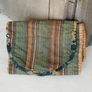 | Heavy Leather BrogansA pair ankle length, heavy leather brogans wtih front ties, three lacing holes, rounded toes, pegged sole and nailed stacked heel. No tongue and metal toes. C1840 - 1860. $115 | Revolutionary War RollupOr housewife, green and tan striped silk outside with smaller tan and green striped cotton inside. Wool embroidered challlis pocket inside. Paper attached reads "Co. Seth Warner a soldier in the Rev. War, Present owner Mrs. Johial Weston". $550 | ||