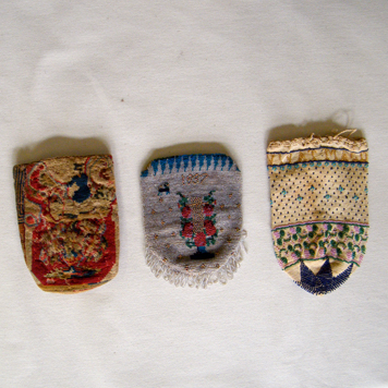 - Make-do pettipoint pocket watch case (?) with a wreath, a butterfly and a man. Cotton lining. Measures 4 inches by 3 inches. Measures 4 inches by 3 inches. $65 - Wonderful dated 1834 beaded reticule/purse with a urn of flowers on front side and "For my father" on back. No ties. Beaded looped fringe on bottom. Could be a memorial piece. Measures 3 1/2 inches by 3 inches. $350 - Beaded reticule/purse dated 1814 with "Vivat Magdalena" in Latiin at top. Translated: Long Live Magdalena. Could be referring to St. Mary Mandalena. Blue star pattern at bottom along with purple and green flowers. Measures 5 inches by 3 1/4 inches. $300 |