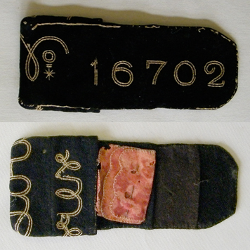 | Hand Knitted SocksHand knitted doll socks 4 1/2 inches from top to bottom and 1 1/4 inches wide at top. Origin: P.A. $85 | Wool HousewifeHousewife made from an old, black wool uniform stitched with numbers 16702 which references a treaties insignia. Red Wool pin panel. Could be dated to the Civil War. Measures 8 inches by 3 1/4 inches. $185 | ||